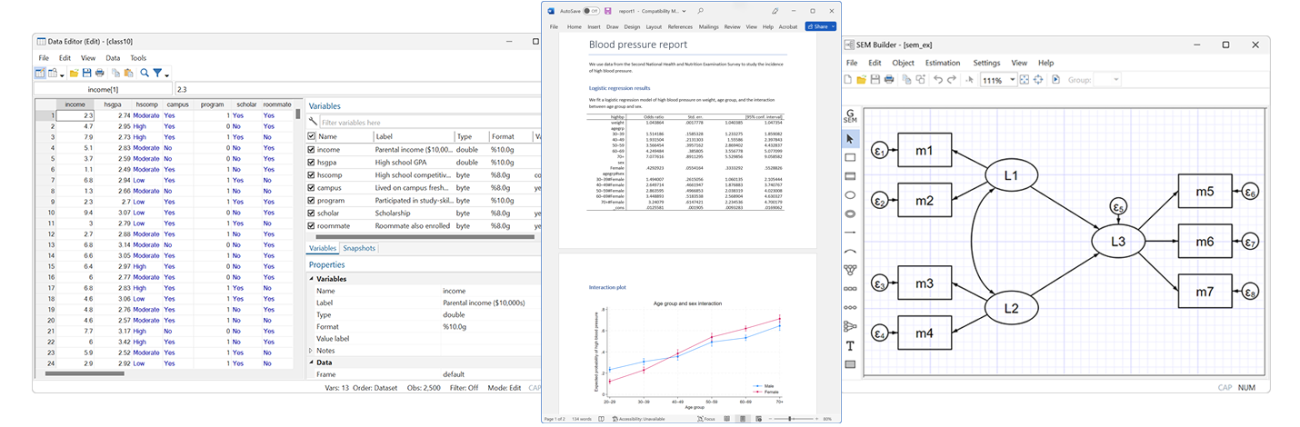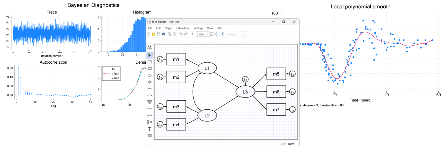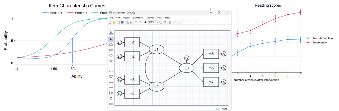 Multilevel mixed-effects models | Structural equation modelling (SEM) | General linear models | Item response theory (IRT) | Linear, binary, and count regressions | Meta-analysis | Multiple imputation | Contrasts, marginal means, and profile plots | Power, precision, and sample size | Choice models | Causal inference | Bayesian analysis | Multivariate methods | Automated reporting and dynamic document generation