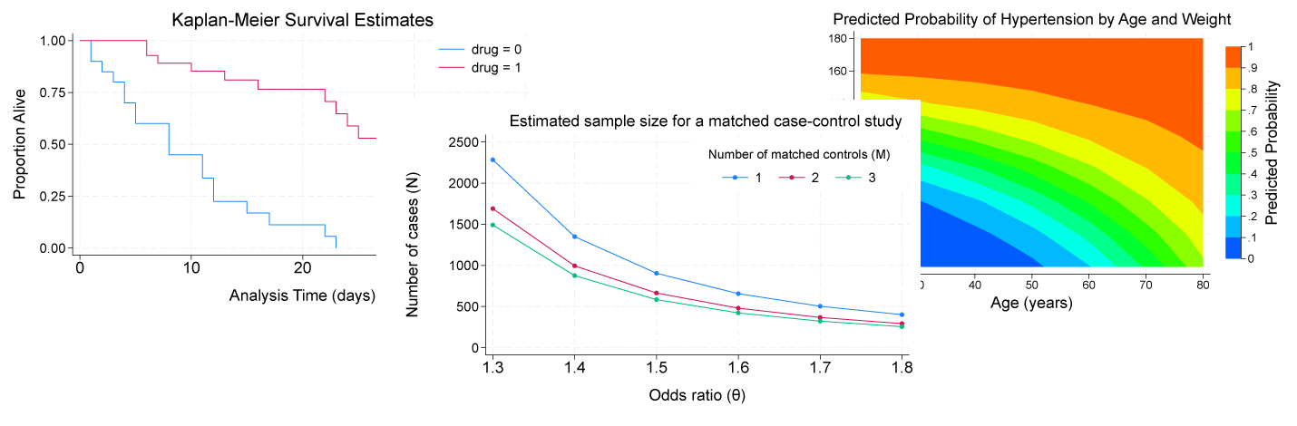 General linear models | Linear, binary, and count regressions | Power, precision, and sample size | Marginal means, contrasts, and interactions | Multilevel mixed-effects models | Meta-analysis | Multiple imputation | Survival analysis | Epidemiological tables | Automated reporting and dynamic document generation