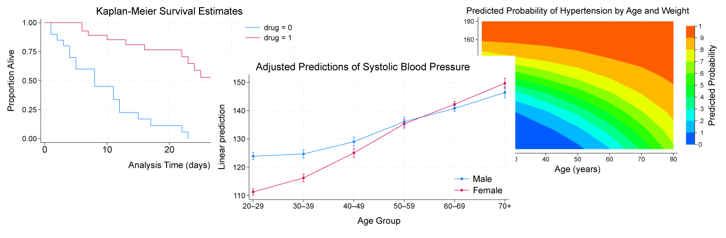 Epidemiological tables | Survival analysis | Linear, binary, and count regressions | Survey methods | Marginal means, contrasts, and interactions | Power, precision, and sample size | Meta-analysis | Causal inference | Multiple imputation | Multilevel mixed-effects models | Bayesian analysis | Automated reporting and dynamic document generation