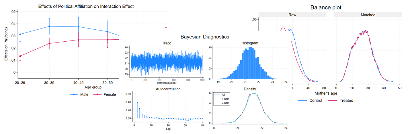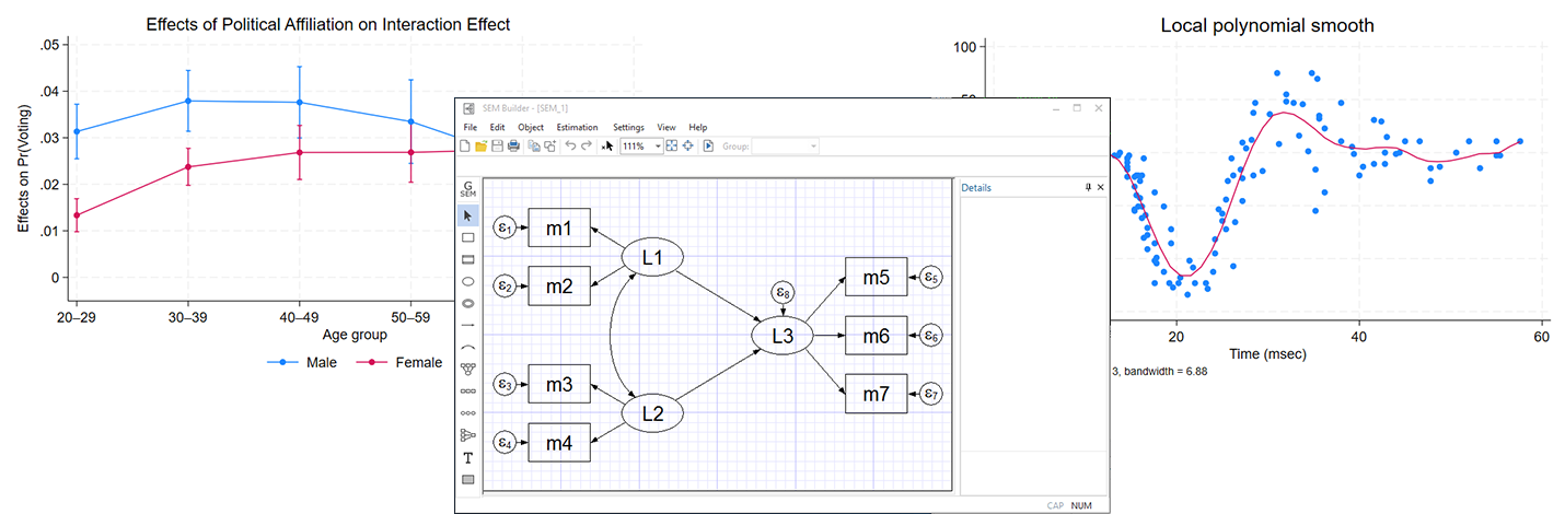 Survey methods | Multiple imputation | Multilevel mixed-effects models | Panel data | Meta-analysis | Linear, binary, and count regressions | Structural equation modelling (SEM) | Adjusted predictions, interactions, and moderation | Choice Models | Bayesian analysis | Causal inference | Programming | Automated reporting and dynamic document generation